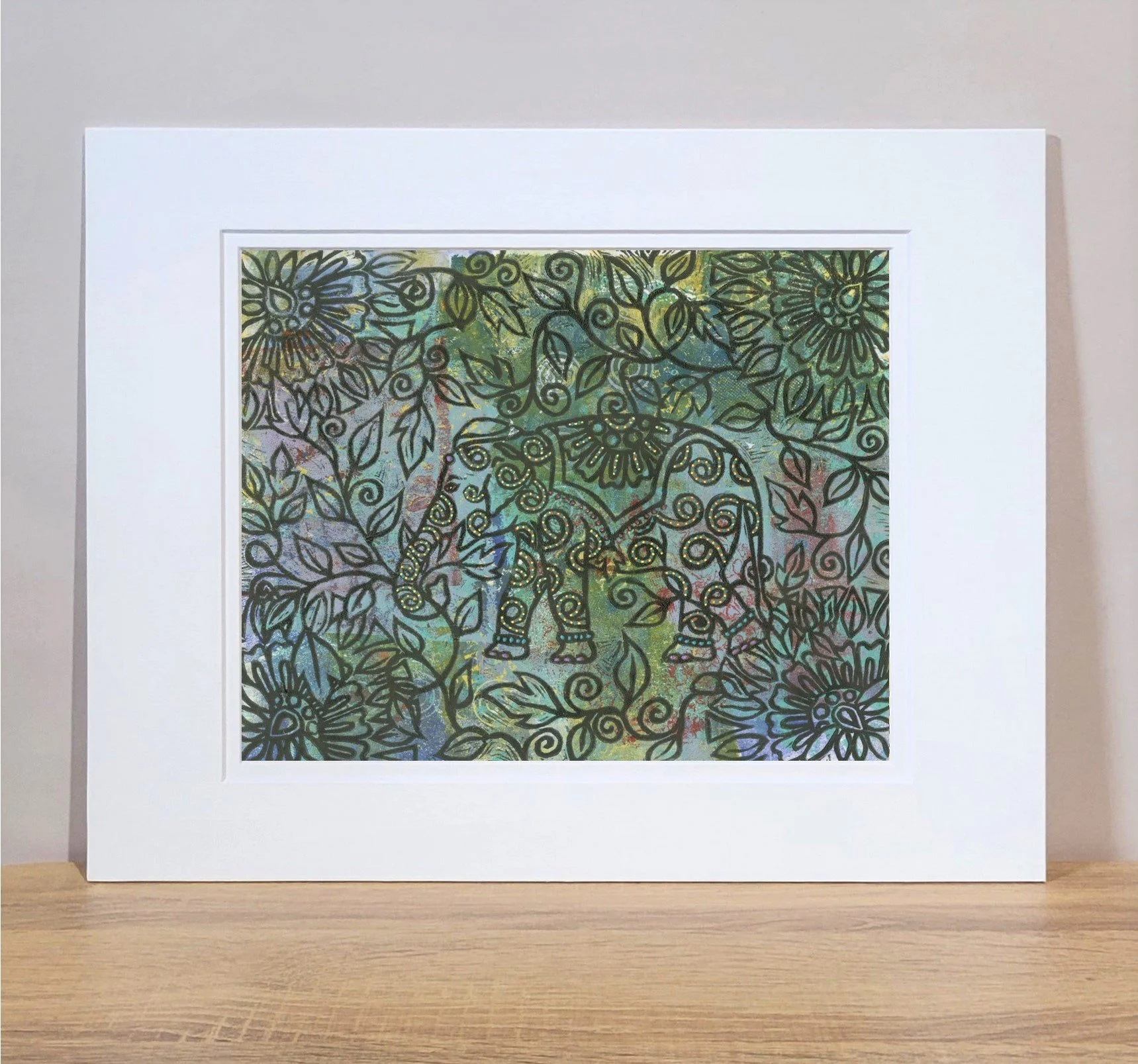 This original artwork was created by my carving the design into a piece of linoleum, inking the carved lino, placing paper I had pretreated with acrylic paints on top of the inked carved lino plate and then hand-rolling it through a press to both transfer the ink onto the paper from the carved lino and also to achieve an embossed effect.