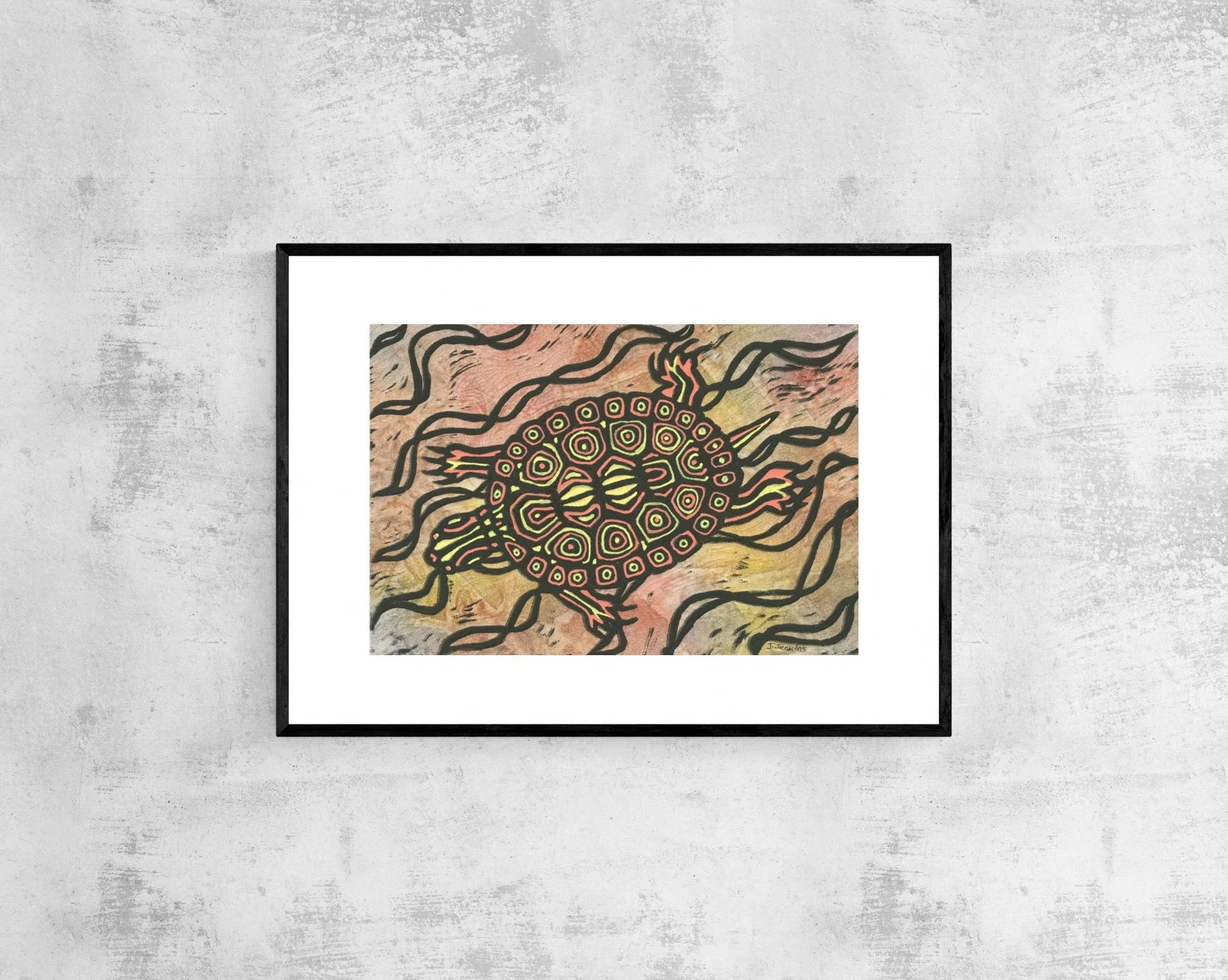 This original artwork was created by my carving the turtle design into a piece of linoleum, then inking it, placing paper I had pretreated with watercolours on top of the inked carved lino plate and then hand-rolling it through a press to both transfer the ink onto the paper from the cut lino and also to achieve an embossed effect.